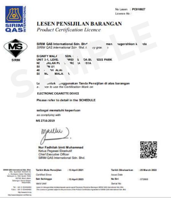 在聯邦政府根據《2011年商品說明法》在憲報刊登《2022年電子煙設備商品說明(認證和標記)令》之后,電子煙的本地制造商和進口商現在必須申請SIRIM認證和標簽。TradeDescriptions(CertificationandMarkingofElectronicCigaretteDevice)Order2022,發布日期:2022.03.31,生效日期:2022.08.03。