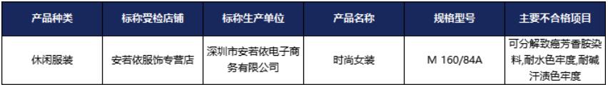 2022年4月,國家市場監(jiān)督管理總局發(fā)布了《2021年休閑服裝等12種網(wǎng)售產(chǎn)品質(zhì)量國家監(jiān)督抽查情況通報》。該通報顯示,深圳市安若依電子商務(wù)有限公司生產(chǎn)的休閑服裝存在可分解致癌芳香胺染料、耐水色牢度、耐堿汗?jié)n色牢度等三個不合格項目。